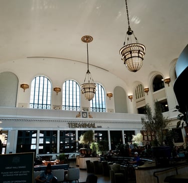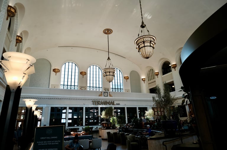 The terminus for the A Line is Denver's Union Station, an ornate Romanesque Revival-style building first constructed in 1881. Both inside and out, the station building is lovely. The exterior features grand facades and neon signs, while the interior has intricate detailing and large chandeliers. In addition to functions such as the waiting room for Amtrak services, the facility also houses businesses like the Terminal Bar, a bar set up in the old ticketing area, and the Tattered Cover Book Store. Once through the terminal building, you find yourself at the corner of Wynkoop and 17th in the heart of LoDo.