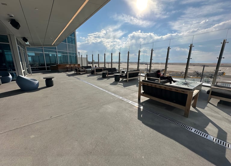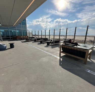 The terminal was a bit chaotic when I arrived, and it took me a while to find the PreCheck line, but once I had it located, it did not take long to get through and onto a train towards the gates. Arriving at my designated terminal, I did find perhaps my favorite passenger amenity an airport can offer: an outdoor patio. With ample seating and good views of the airfield, it was a plane spotters paradise. The comfortable couches were a perfect space to allow me to collect my thoughts and enjoy the views of landing airplanes while the mountains stretched beyond.