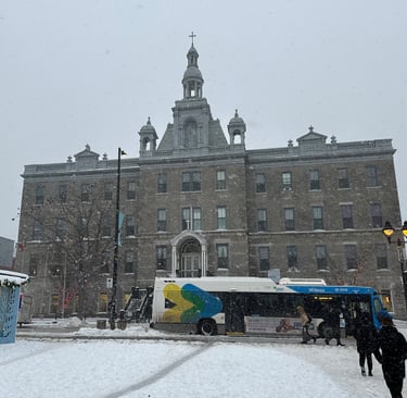 Montréal is a lovely city in all seasons, but we did find that we were visiting much outside of the normal tourist season. Many of the typical shops one expects to find in tourist destinations: ice cream parlors, souvenir stalls, and fancy restaurants, were closed and shuttered. We further found out why Montréal does not have a thriving tourist economy in the winter as we walked along the Parc Linéaire de la Commune and the Saint-Laurent; it was very windy and incredibly cold. While rather picturesque in some sections, the grey sky threatening to unleash snow at any moment did not also paint attractions in the best light, literally. Along this section are a few other notable destinations within Montréal like Le Grande Roue, Centre des Sciences de Montréal, the Clock Tower, and Habitat 67. We decided to head more into the city to escape from the windchill when we came across Place Jacques-Cartier and followed the street up to the main government complex in Montréal. This area is home to various courts and administrative buildings, from the neoclassical Édifice Ernest-Cormier to the modernist Palais de Justice.