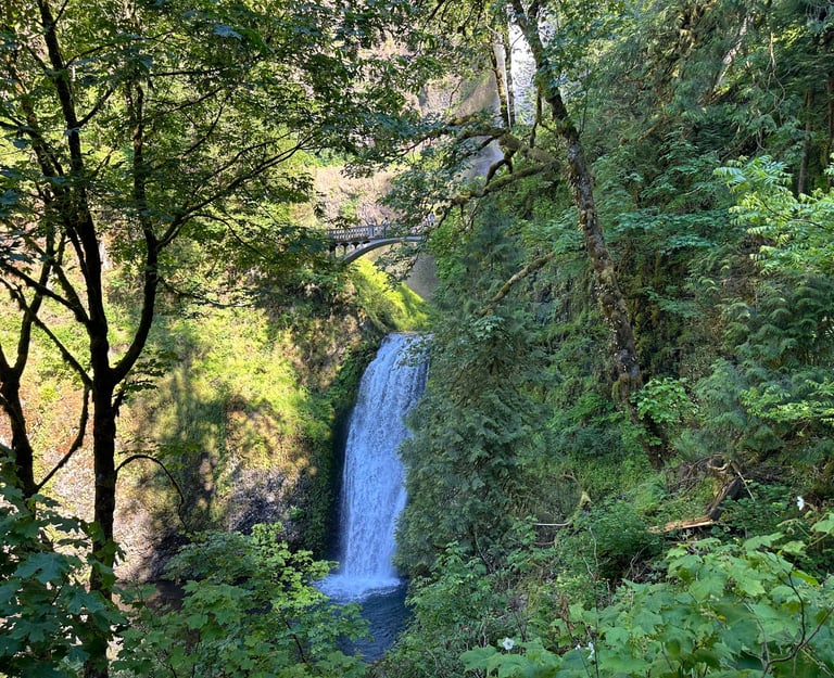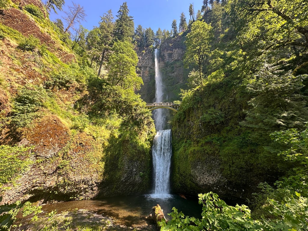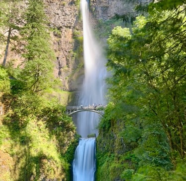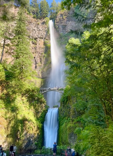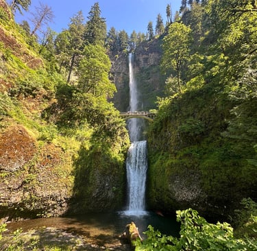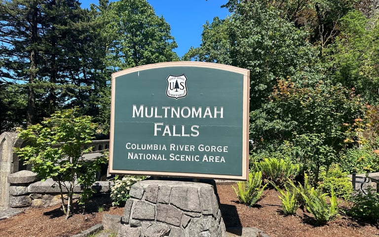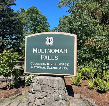 Even from the parking lot entrance, we could tell that the falls were amazing. Multnomah Falls spans two tiers and is the tallest waterfall in Oregon. The site first gained popularity as a stop on the Oregon Railways between Portland and Pasco starting in 1884, with the trail and bridge constructed in 1915, followed by the lodge in 1925. Although passenger rail no longer serves the falls, the train tracks are still there, and you can occasionally catch a Union Pacific rolling by.