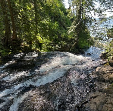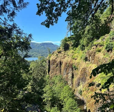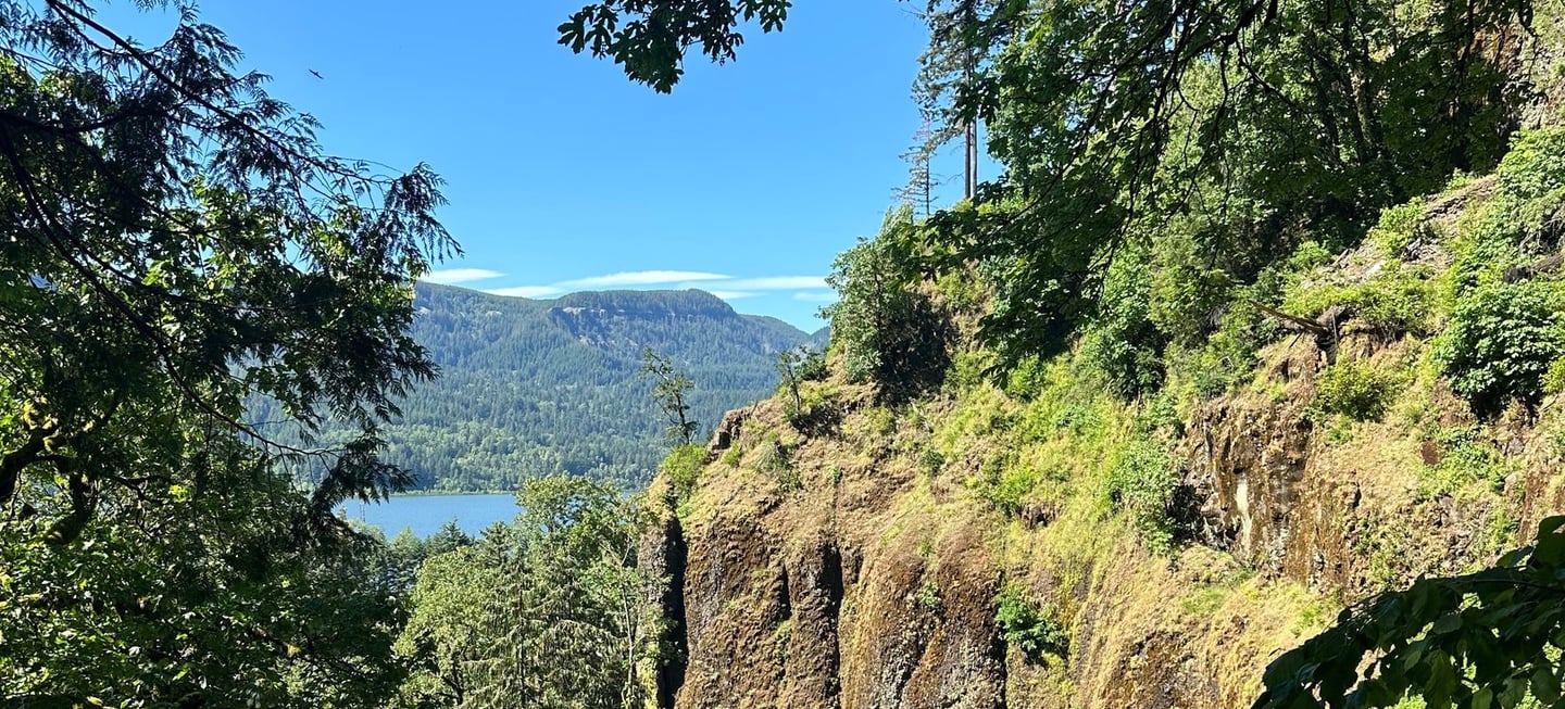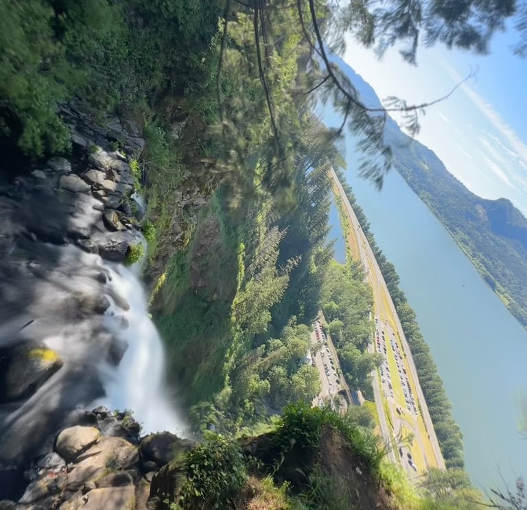 Past the bridge is a relatively short but quite steep trail to the top of the falls. The roundtrip is approximately 2.25mi or 3.6km and takes about an hour and a half. The distance is short, but the trail is quite steep with a climb of over 800 feet (240m) in just over a mile. Along the way are 11 switchbacks, and you feel the elevation change at the various signs. While it is not a particularly strenuous or technical trail despite the elevation, those looking to hike the falls should come prepared with proper footwear, comfortable attire, and water. Additionally, maybe skip this hike if you are afraid of heights as there are many sections of the trail that have steep cliffs off the side without any railing, or if you have mobility concerns as the trail is unpaved. Despite these warnings, the views available along the river gorge are unmatched; the expanse of the Columbia River is an amazing sight to behold. Finally reaching the top of the trail, we were met with a lush and tranquil creekside with some smaller falls and rapids to relax by after our hike up. There is also a viewing platform to see the falls plunging over 540 feet (165m) down its main drop.