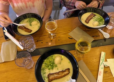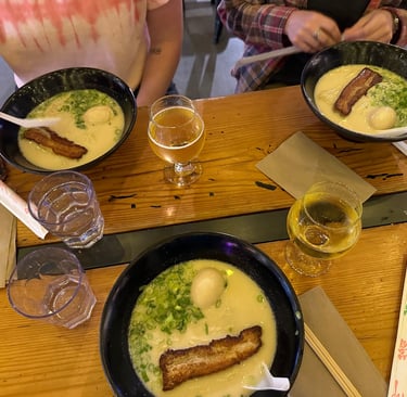 The bus ride back to Portland was just as scenic as the ride out to the falls, if not more so thanks to the quickly lowering sun starting to cast more of the gorge in shadows and paler shades. After a quick MAX ride from Gateway to Skidmore Fountain station, we found ourselves at Pine Street Market, a food hall with a variety of offerings. Based on our ravenous hunger and strenuous day, a rather hearty portion of ramen seemed in order along with some ciders. It was delectable, with the noodles being the right amount of chewy and the chashu pork. For dessert, we picked up some moon cakes from another stall in the food hall as a perfect top-off for the day.