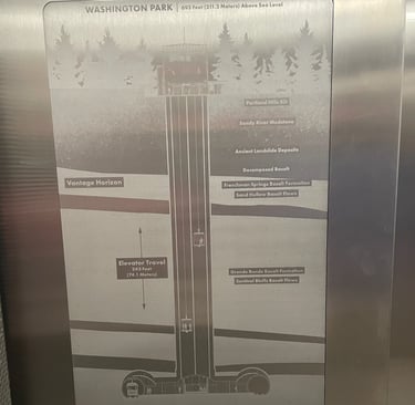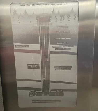 We hiked for a few miles before reemerging from the forest near the Oregon Zoo, ready to catch a train from the Washington Park station on MAX. Washington Park itself describes the parking situation as “paid and extremely limited”, two things I prefer not to deal with whenever possible, so I was glad to have such easy access to a wonderful city amenity via public transit. The Washington Park station MAX is not only the only completely underground station on the network, but also the deepest transit station in North America at 260 feet below the surface. The station is so deep that there are not stairs or escalators to reach the platform level during normal operation, rather elevators which include a diagram showing just how deep the station is. At platform level there are other displays available too, such as a core sample from the drilling of the Tunnel and etchings showing some archeology of the local area. After a brief wait, our train arrived, taking us eastbound from the park to our next adventure.