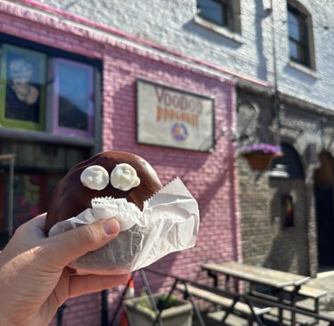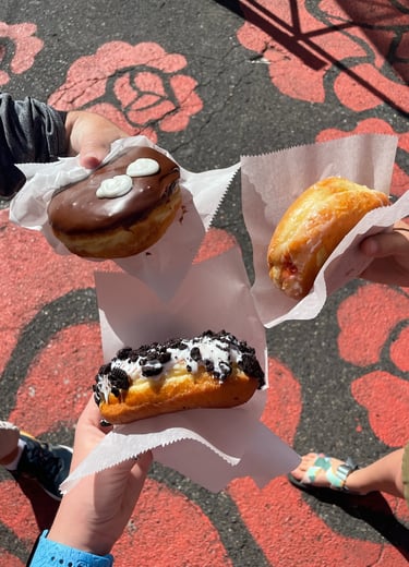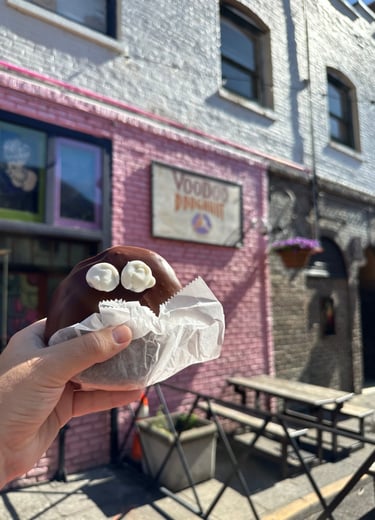 Waking up the next morning feeling like a person again, my travel crew and I decided the best way to start a day full of adventuring and lots of physical activity would be with a breakfast of low nutritional value. Before coming, we had spoken with another mutual friend who was a resident of the Pacific Northwest, and they gave us a small list of things we needed to see/try. On that list is one of the city's prime eating establishments, Voodoo Doughnut. We traversed the ten or so city blocks from our hotel to the flagship location, along the way getting a feel for the cityscape including popular sites such as Portland City Hall and Stumptown Coffee Roaster's flagship location before finally seeing the pink brick building adorned with neon.