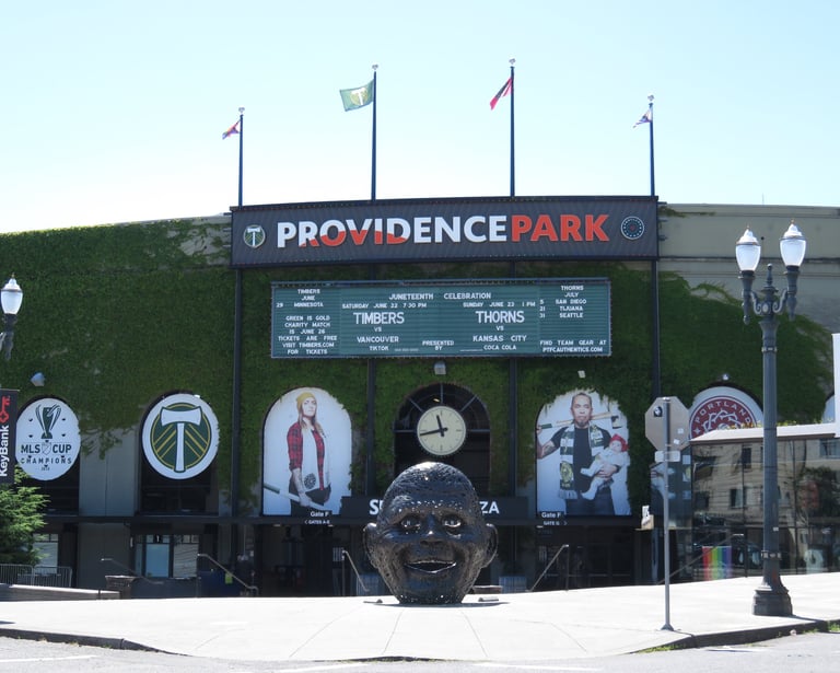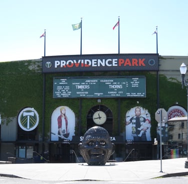 Weighed down with new books and the like, we were soon on our way westbound again, climbing higher through the city, stopping along the way to see Providence Park. The park is where Portland’s soccer teams (the Thorns of NWSL and Timbers of MLS) play, and is thought to be the oldest soccer-specific stadium used by an MLS team, first opening in 1893. We also made a stop for coffee at a staple of the Pacific Northwest, Dutch Bros. The opinion of the group seems to be overwhelmingly “it’s okay.”